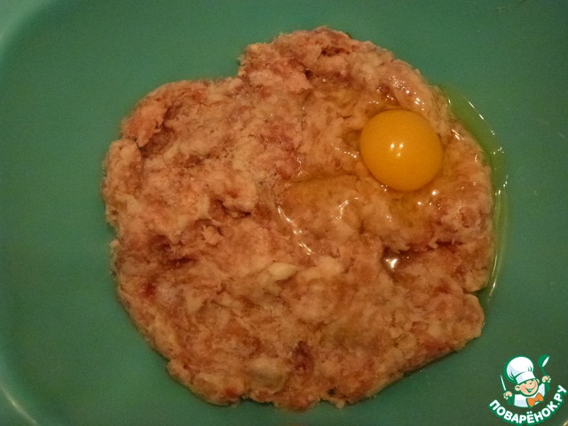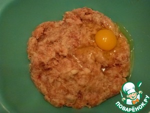 К фаршу добавить 1 яйцо, 2-3 ст л. холодной воды. Посолить, поперчить. Все перемешать.