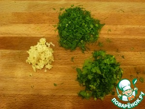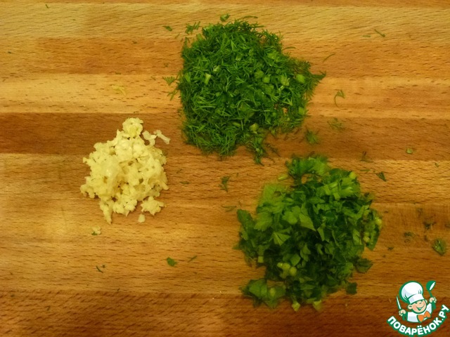 Зелень помыть и мелко порезать. Чеснок натереть.