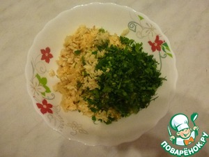 Яйца, зелень и чеснок перемешать. Начинка готова. Если начинка сухая можно добавить растительного масла.