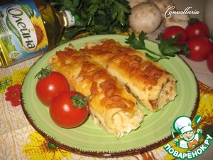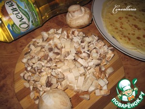 Это блюдо идеально на завтрак - тонкие блинчики с сытной начинкой из пшеничной крупы и шампиньонов. С вечера можно напечь блинчики и приготовить начинку, а с утра залить сливками, посыпать сыром и запечь в духовке.