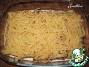Залить сливками и посыпать тертым сыром.