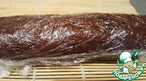 Остатки шоколада я смешала с остатками арахиса и намазала этой массой колбаску. Завернула в пищевую плёнку, прижала ковриком для суши и убрала в морозилку. Можно положить в холодильник.