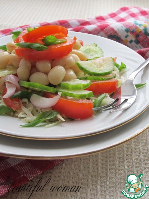 На блюдо выкладываем салат: капусту, рядом фасоль.