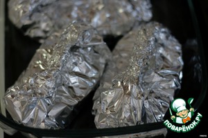 Тщательно заворачиваем (даже при незначительных разрывах фольги повторяем этот шаг до получения идеального результата), кладем в форму и ставим в духовку минут на 20.