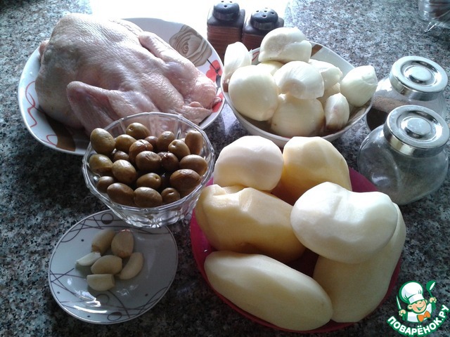 Наша курочка готова. На большую красивую тарелку выкладываем курицу, поливаем вокруг нее соусом, раскладываем оливки. Так же кладем картофель прям на соус. Если есть зелень то так же украшаем курицу. У меня, к сожалению ее не оказалось.