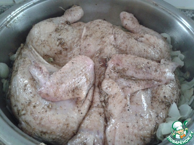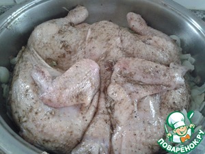 Хорошенько натираем этой смесью нашу курочку, стараемся там где это возможно промазать и под шкуркой.