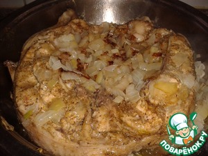 Перекладываем нашу курицу с луковым соусов в форму для запекания и ставим в духовку до зарумянивания курицы. Соус тоже должен загустеть.