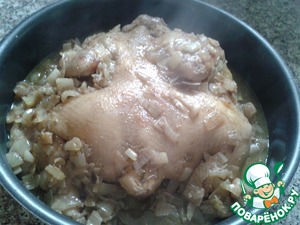 Выкладываем на лук нашу курочку, накрываем крышкой и обжариваем 5 минут.