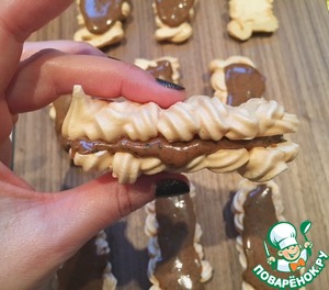 Нужно аккуратно намазать кофейно-шоколадную массу на одну часть безе и прикрыть второй половинкой.