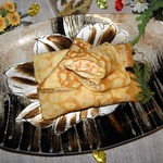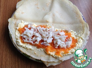 На блин выложить яичную смесь и сверху морковь. Выложить кальмары и свернуть блин рулетом.