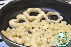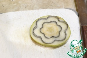 Из твердой груши при помощи металлических формочек вырезаем "петельки" для блинных мешочков. Мягкую грушу нарезаем мелкими кубиками, сбрызгиваем как следует наши груши лимонным соком.