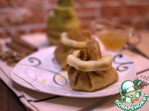 Собираем при помощи грушевой формочки блинчик в мешочек. Подаем, полив соусом.
