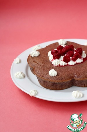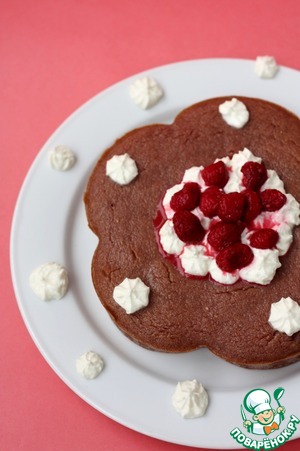 Остудить пирог, покрыть взбитыми сливками и украсить малиной.