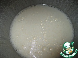 Кукурузную и рисовую муку просеять с разрыхлителем в яичную смесь. Сверху влить молоко.