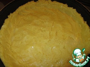 Смазать маслом форму и выложить туда тесто. Распределить его по дну формы мокрой ложкой или мокрыми руками. Обязательно сделать бортики хорошие не тонкие.