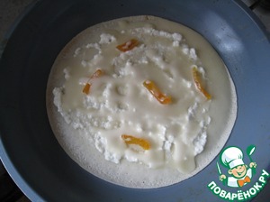Разогреваем сковороду, смазываем ее маслом и наливаем порцию теста. Распределяем блин по всей поверхности сковороды тонким слоем. На слой теста выкладываем творог с наполнителями и курагу.