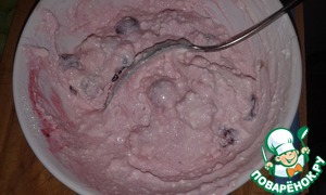 Творог смешать с йогуртом, сахаром и вишней