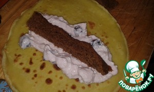 На блинчик уложить творожную массу, в центр кусочек кекса и свернуть рулетом