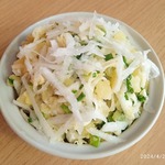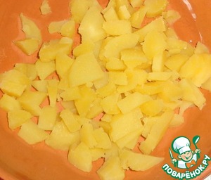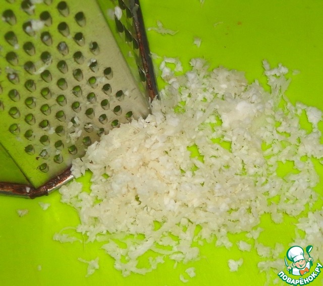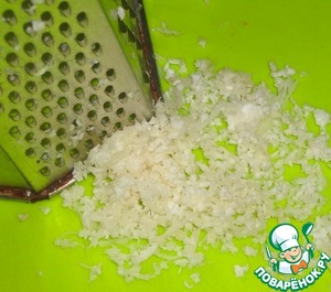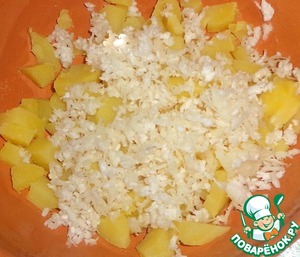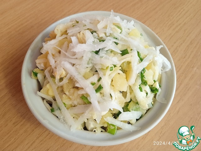 Соединить дайкон и картофель. Добавить тертый чеснок.