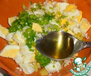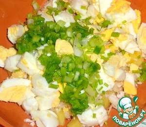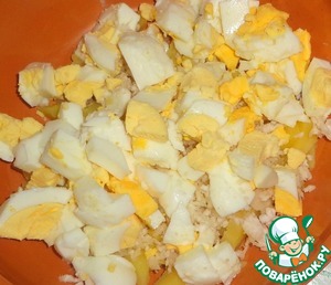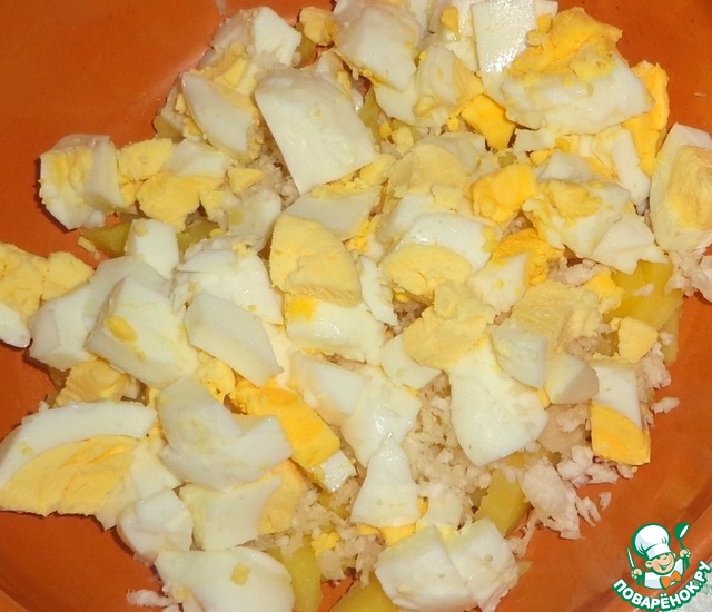 Отварные яйца порезать крупными кусочками и добавить в салат. Перемешать.