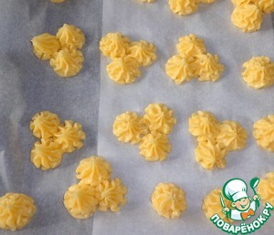 Отсадить на противень тесто в виде трех цветочков вместе.