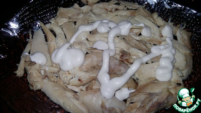 Куриные окорочка отварить, разобрать на волокна, выложить на блюдо и слегка промазать майонезом. Миндальные лепестки обжарить на сковороде и посыпать курицу.