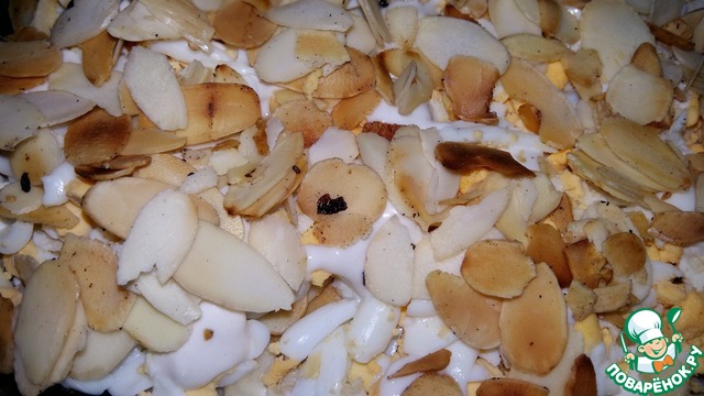 Варенные яйца натереть на крупной терке, выложить на миндаль и промазать майонезом. Затем снова слой орехов и тертого сыра.