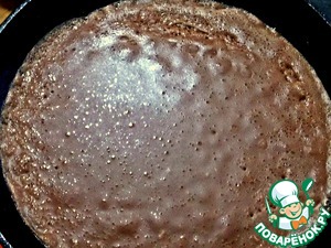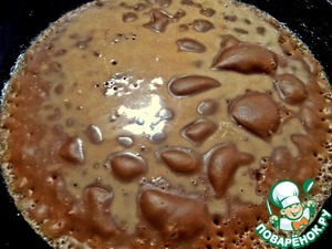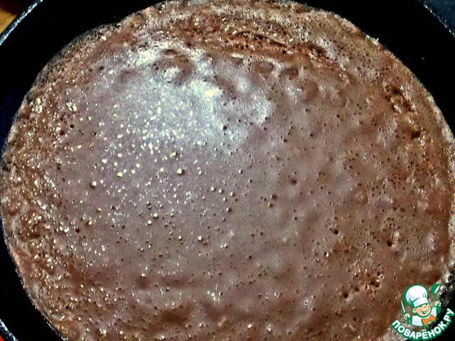 • Смазываем немного чугунную сковороду маслом и наливаем жидкое блинное тесто.