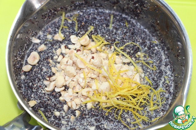 К горячей маковой массе добавить измельченные орехи и изюм, коньяк, лимонную цедру и сок лимона, перемешать. Дать полностью остыть. Начинка должна быть влажной.