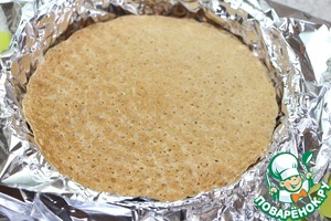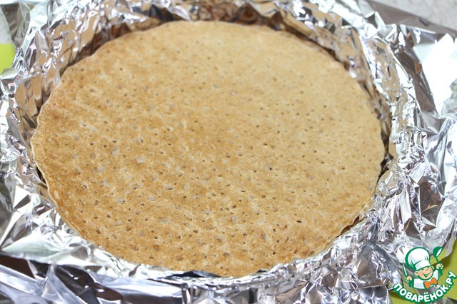 Глубокую круглую форму для выпечки выстелить фольгой или пергаментом. Выложить блинчик, нанести слой начинки, так выложить все блинчики, промазывая каждый слой начинкой, пока начинка не закончится. Верхний блинчик начинкой покрывать не нужно.