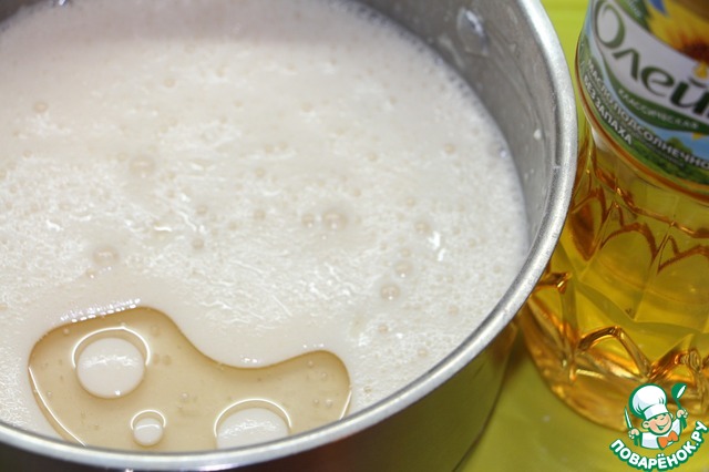 Добавить к молочной смеси муку, и подсолнечное масло Олейна. Взбить, чтобы не было комочков. Оставить тесто на 30 минут.
