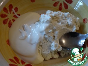 Для соуса взбиваем рикотту со сливками, добавив обычный и ванильный сахар.