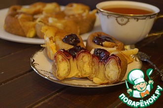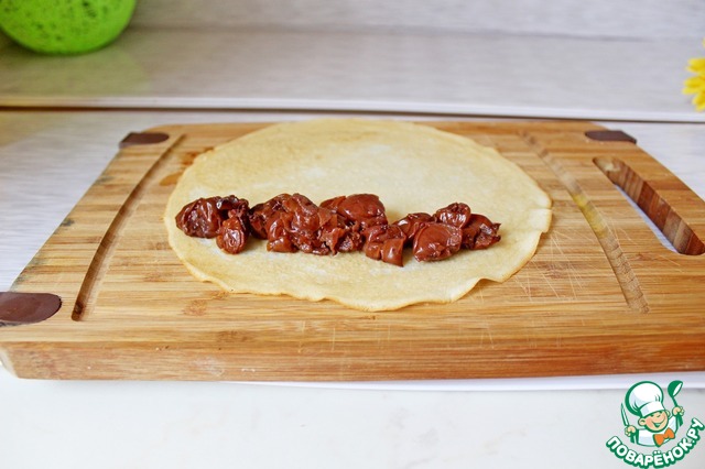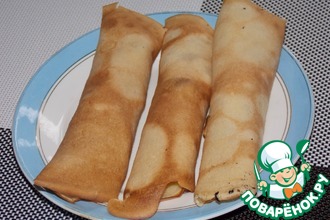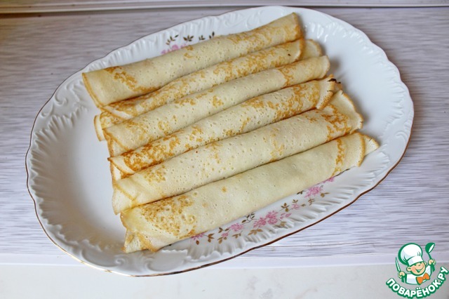 Свернуть блины с вишней в трубочку и выложить на блюдо по принципу "Монастырской избы". Первый ряд-6 блинов.