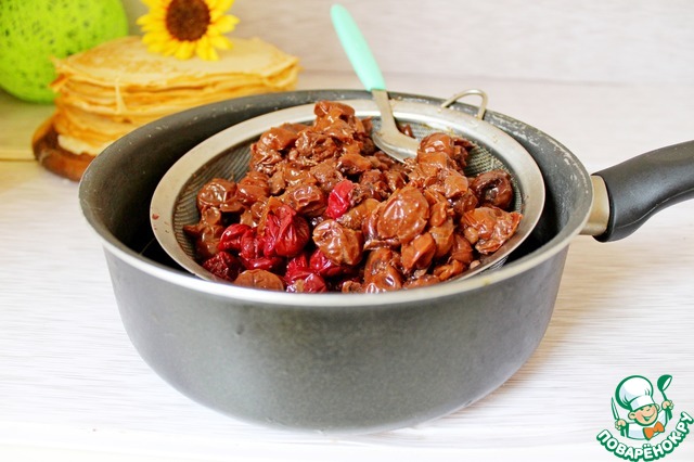 Я использовала консервированную вишню. ее заранее надо откинуть сито и дать стечь соку.