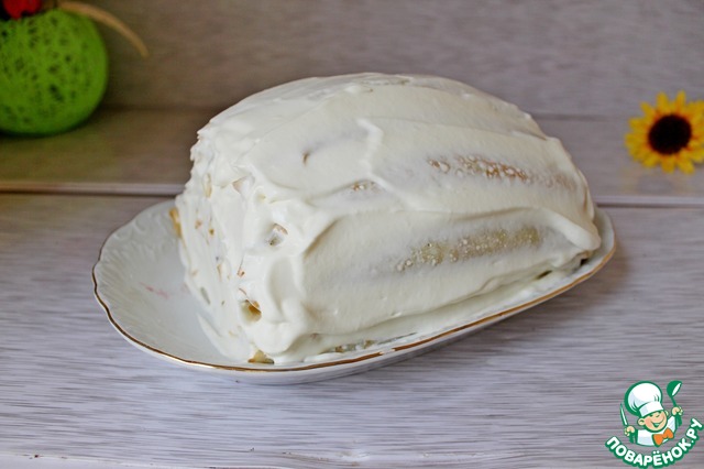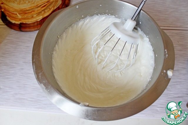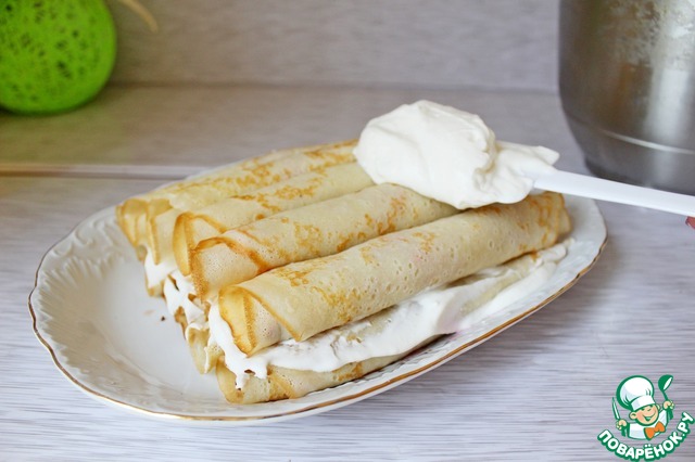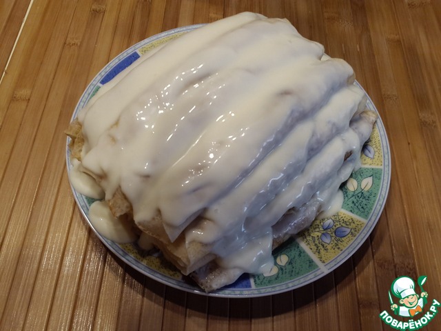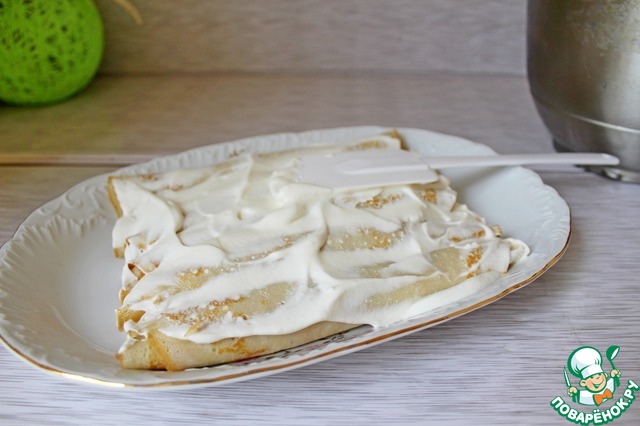 Следующий ряд-5 блинов-сметанный крем, затем 4,3,2,1, промазывая каждый ряд сметанным кремом. Также хорошо промазать кремом бока.