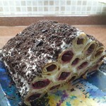[+3]По торту. Блины были в количестве 15 шт., диаметр сковороды 26 см. Вишни ушло примерно 800 гр, с базара принесла килограмм, пару горстей в рот, остальное в торт. Крем адаптированный, ибо нет у нас сметаны в общем доступе. Для лжесметанного крема 220г сюзьма йогурт, добавила до 500г лабне сыр и сливки примерно поровну и взбила с сахаром. Могу сказать, что лучше бы я намазала пару ложеек под первый слой. Крем ушел почти весь, кроме небольшого количества.