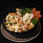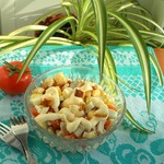 Все ингредиенты нарезаются небольшим кубиком, приблизительно 1х1 см.