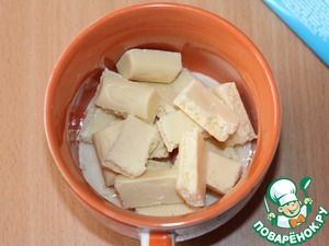 6. Кладем в глубокую чашу дольки шоколада и сгущенку.