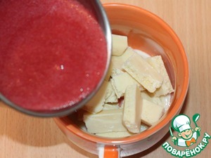 13. Затем смешиваем белый шоколад с 3 ст. л. протертой через сито облепихой (можно и другую ягоду). Прогреваем смесь на водяной бане и смазываем блинчики. Немного их охлаждаем