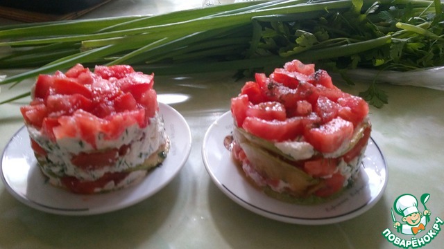 • В формочку выкладывать овощи послойно в произвольном порядке, промазывая каждый слой сырной массой.