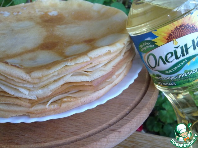 Печем блины в количестве 9 штук, по вашему любимому рецепту и остужаем их. В тесто для блинов я добавила 3 ст. л. подсолнечного масла "Олейна".