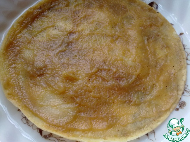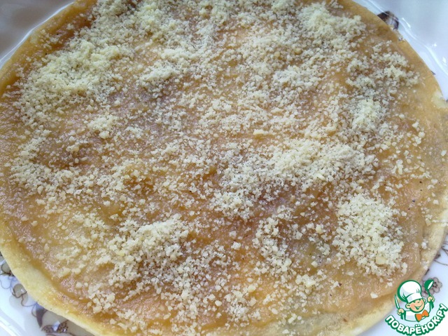 Кладем на дно блин, намазываем его тонким слоем яблочного пюре.