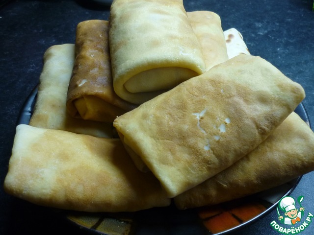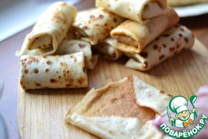 На каждый блин выкладываем начинку и заворачиваем в конвертик.