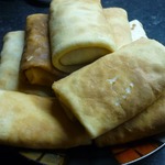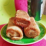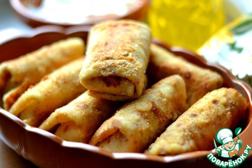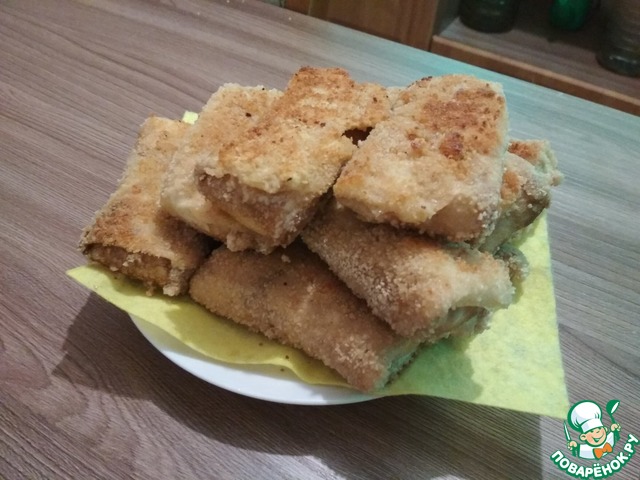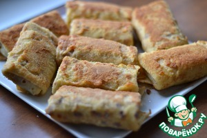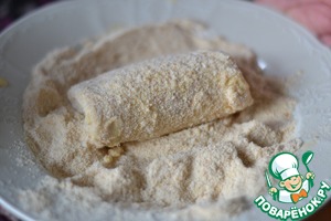 Обвалять блинные конвертики сначала в муке, потом в яйце и наконец в сухарях.