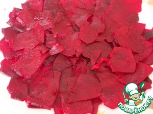 Остывшую свеклу почистить и нарезать на тонкие полосочки, с помощью овощечистки.