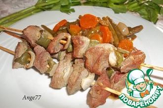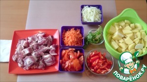 Обжариваем лук, морковь, перец сладкий и свинину, добавляем воду, солим и тушим 30минут.