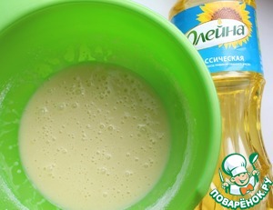 Сделать тесто для крепов. Отделить белки от желтков. Желтки смешать с 50 г сахара, молоком, мукой, подсолнечным маслом и цветочной апельсиновой водой. Взбивать миксером 2-3 минуты.