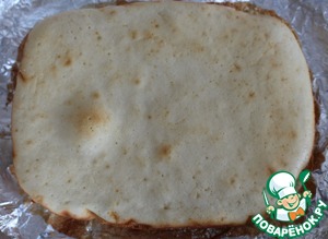 Форму проложить пергаментом или фольгой. Вылить тесто и распределить по всей поверхности таким образом, чтобы толщина теста составляла 1 см. Выпекать в предварительно разогретой до 180 градусов духовке 10 минут. Дать остыть и разрезать на 2 части. Каждую часть промазать абрикосовым вареньем.