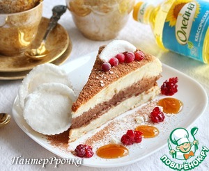 Чем же интересен этот торт? Во-первых, необычное тесто для крепов, которые выпекается в духовке, с легким апельсиновым ароматом. По вкусу получается что-то среднее между традиционным блином и бисквитом. Во-вторых, воздушный мега-шоколадный крем, просто тающий во рту. Его можно есть ложками. И в-третьих, вкусовое сочетание. Десерт получается очень гармоничным. А кислинка от клюквенного джема и абрикосового варенья, горчинка от какао и сладость от безе завершают идиллию. Идея взята у итальянского шеф-повара.