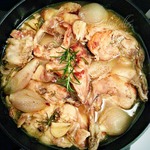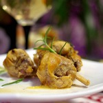 Как только кролик зарумянится, влить белое вино, добавить стакан воды, посолить и поперчить по вкусу. Положить лук, чеснок и розмарин. Накрыть крышкой и тушить на слабом огне 1 час. За это время пару раз перевернуть кусочки кролика.
